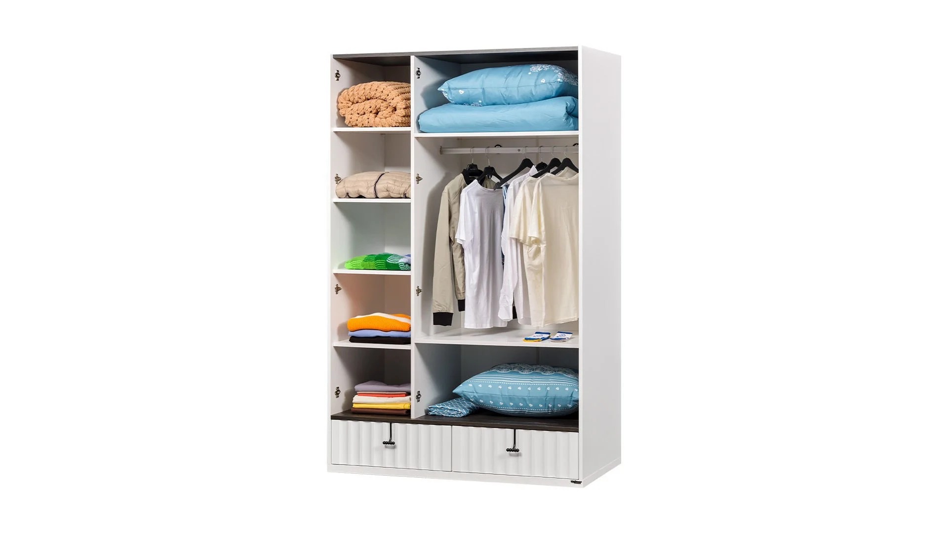 Largeur : 131 cm Hauteur : 205 cm Profondeur : 63 cm Des panneaux de particules mélaminés sont utilisés et présentent une haute résistance à l'eau et à l'humidité et...