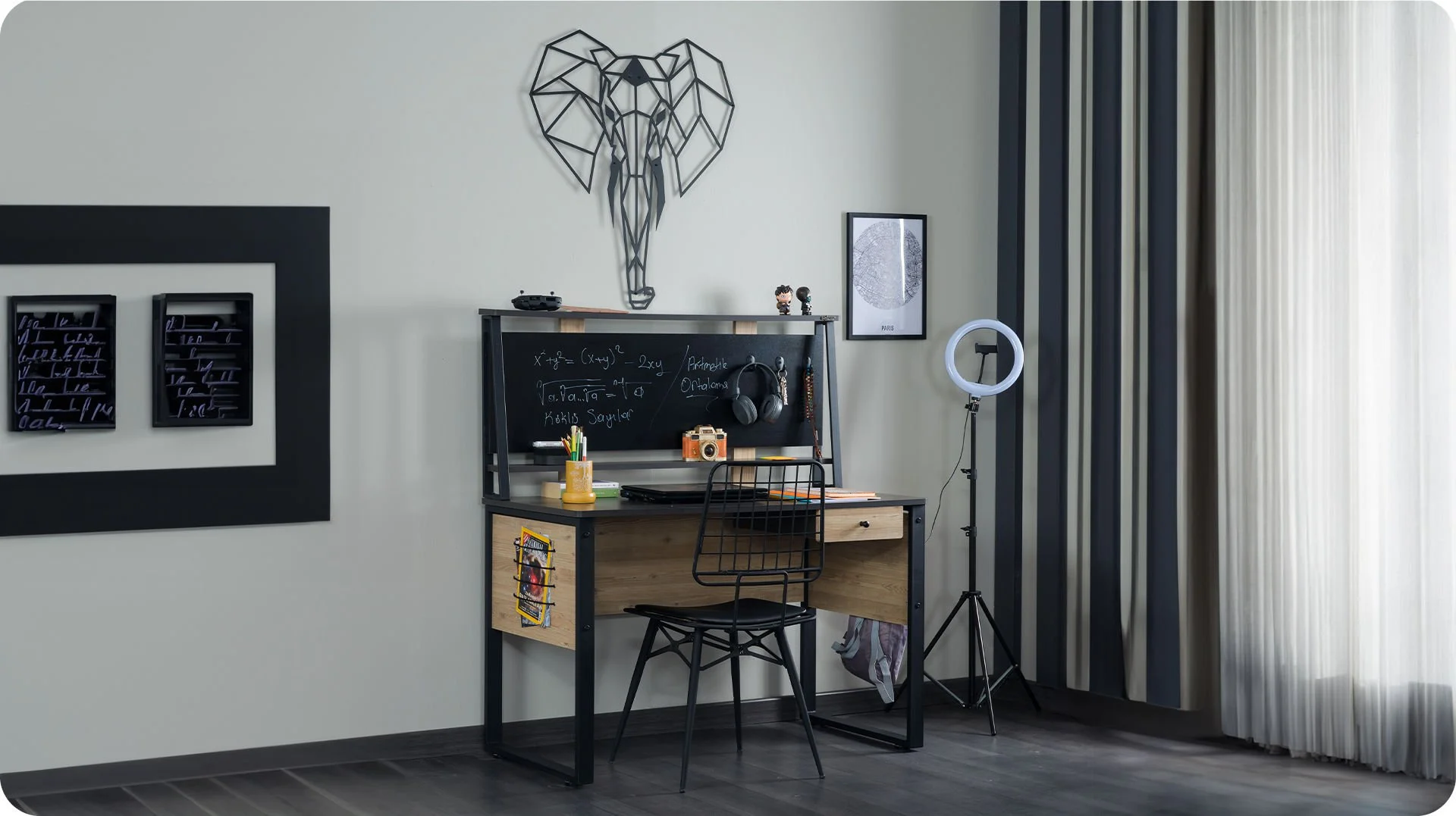 * Tableau suspendu et craie liquide posés sur l’appareil.
