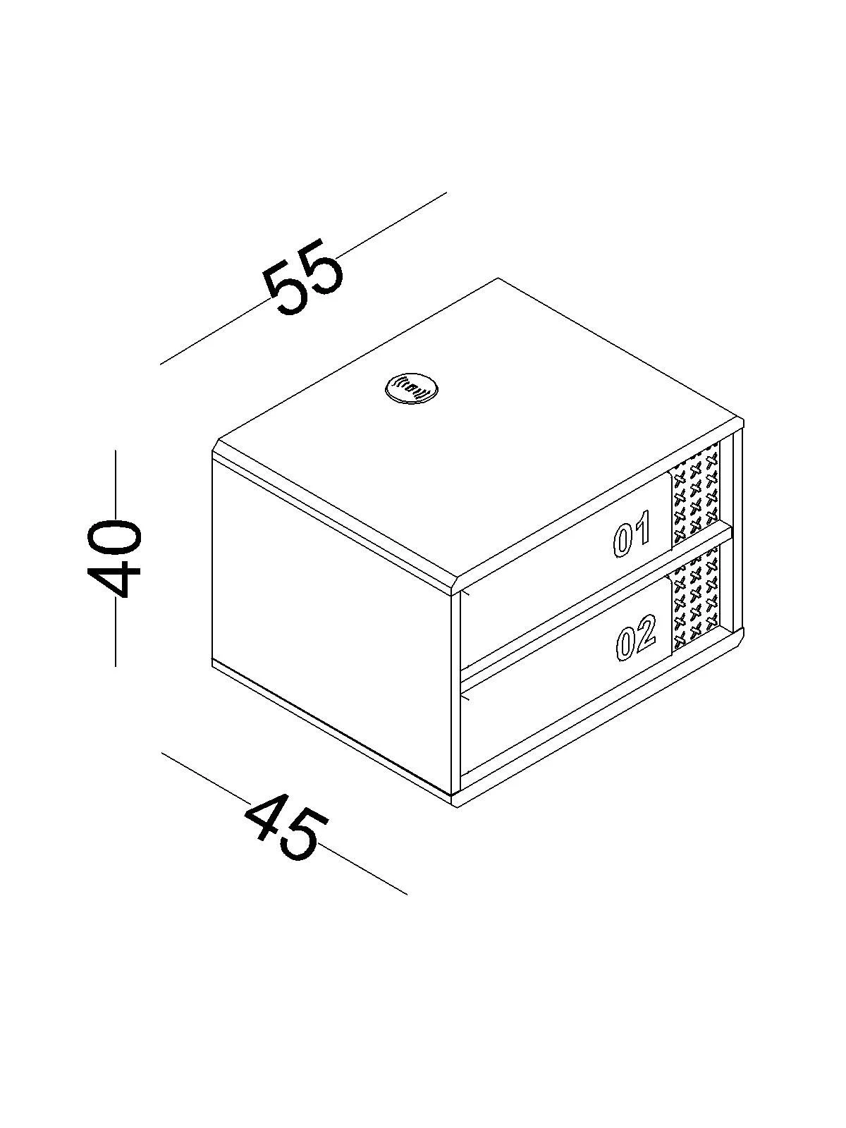 Largeur : 55 cm Hauteur : 40 cm Profondeur : 45 cm Des panneaux de particules mélaminés sont utilisés et présentent une haute résistance à l'eau et à l'humidité et...